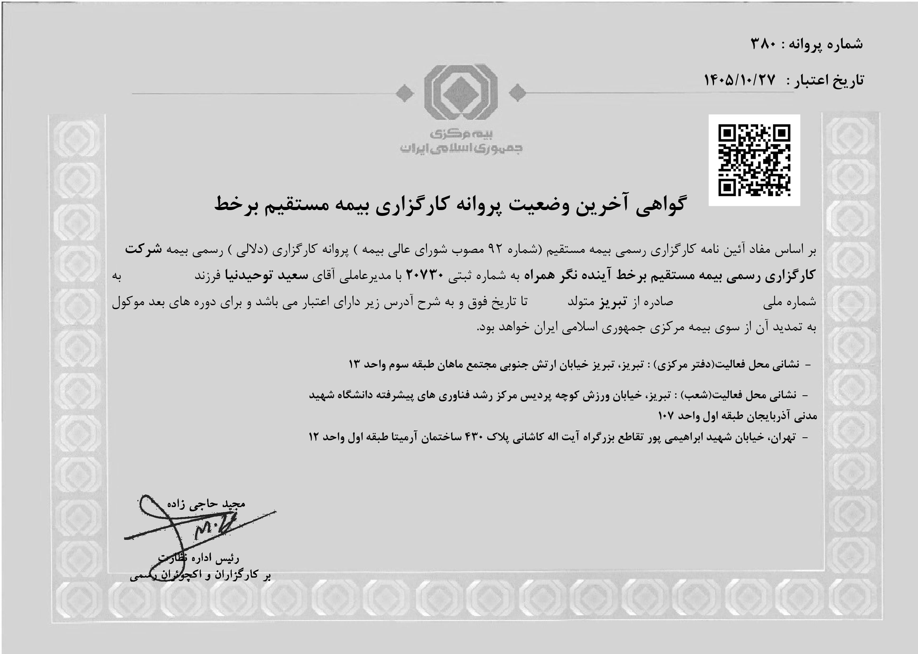 این شرکت به صورت شرکت سهامی خاص به شماره ثبتی 20730 طی مجوز شماره 31218 مورخه 85/10/27 از بیمه مرکزی جمهوری اسلامی ایران طبق ماده 68 قانون تاسیس بیمه مرکزی جمهوری اسلامی ایران و بیمه گری مصوب 1350/03/30 به مدیریت عاملی آقای ایوب توحیدنیا با کد 380 در کلیه رشته های بیمه بازرگانی شروع به فعالیت در امور کارگزاری بیمه نموده است و دارای کد همکاری با کلیه شرکتهای بیمه دولتی و خصوص در سراسر کشور می باشد.